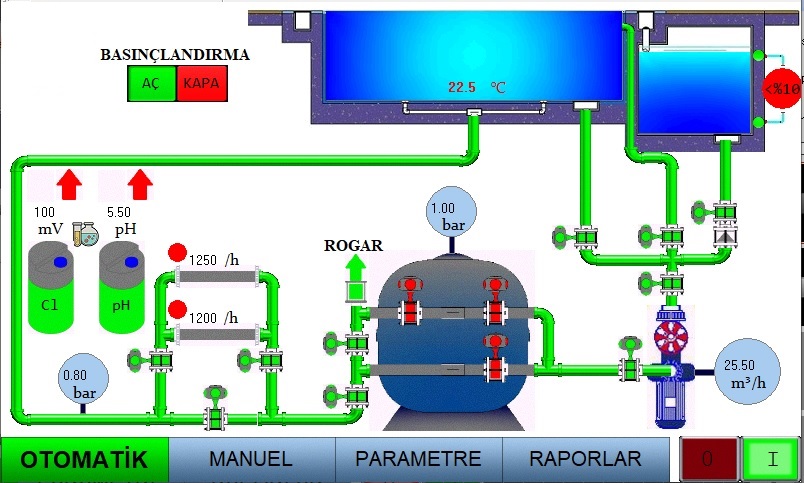 Havuzların Su Filtrasyonu sistemde bulunan sirkülasyon pompaları ile havuz'dan gelen pis suyu filtre sistemleri üzerinden geçirerek yapılır. Sistemin anlık basınç, sıcaklık, debi kontrolü sağlanır temizlikte kullanılan ekipmanların çalışma ömürleri tutularak bakım zamanları, kullanıcıya temizlik ekipmanlarının ömrü dolmadan haber verir.Haricen sistemden deşarj ettiği pis suyu ve sisteme ilave ettiği temiz suyu rapor halinde kullanıcıya sunar. Sistem devamlı çalışabildiği gibi bir zaman çizelgesine bağlı olarak da çalışabilir.